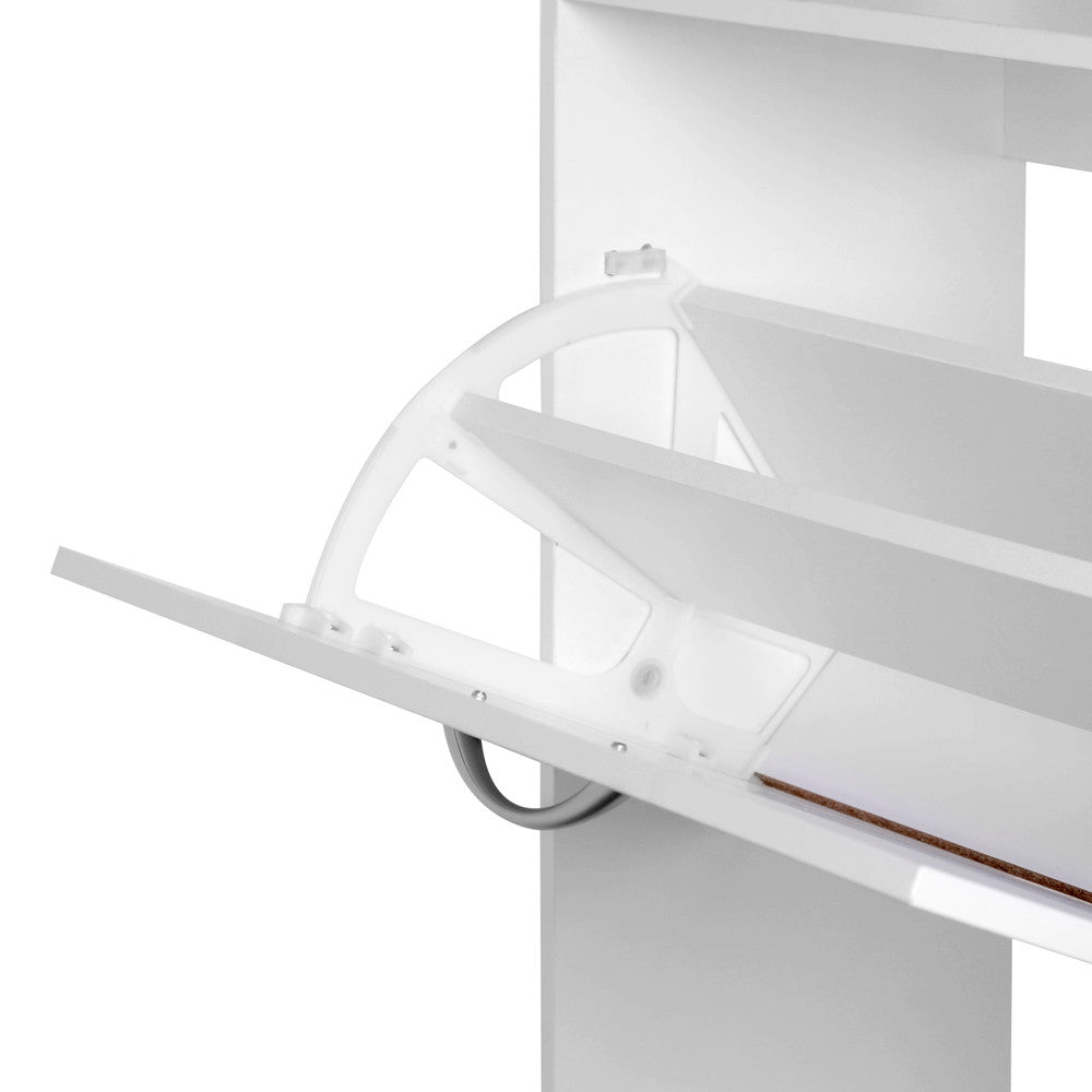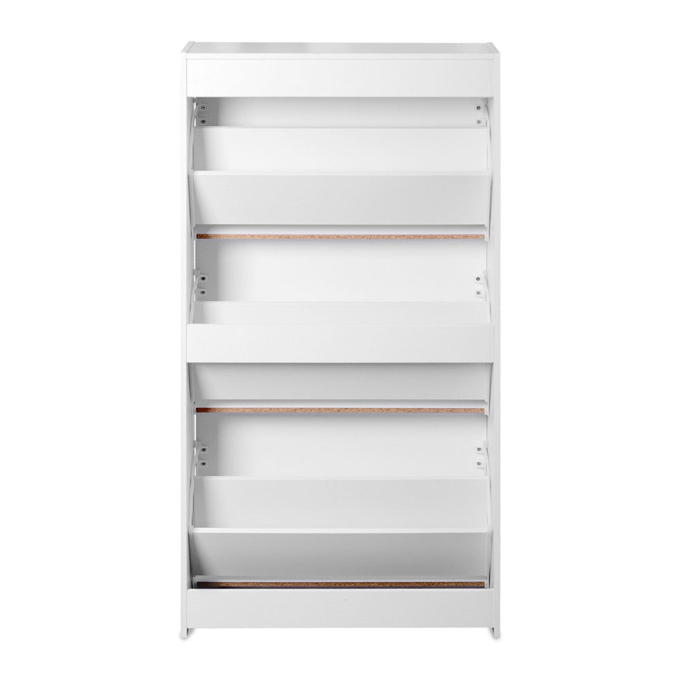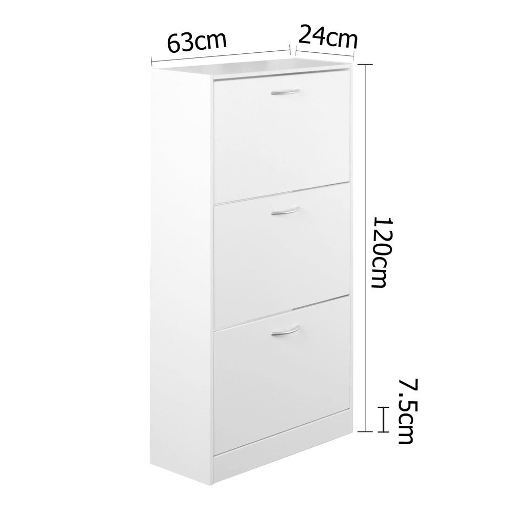 Start organising your collection of shoes with this elegant shoe cabinet. Featuring particle board with melamine veneer, plastic handles in silver powder coated and a sleek stylish contemporary design, this quality made shoe cabinet easily matches any décor. It's constructed with three large storage cupboards that store up to 18 pairs of shoes. Great for organising your favourites, just perfect for your storage needs!