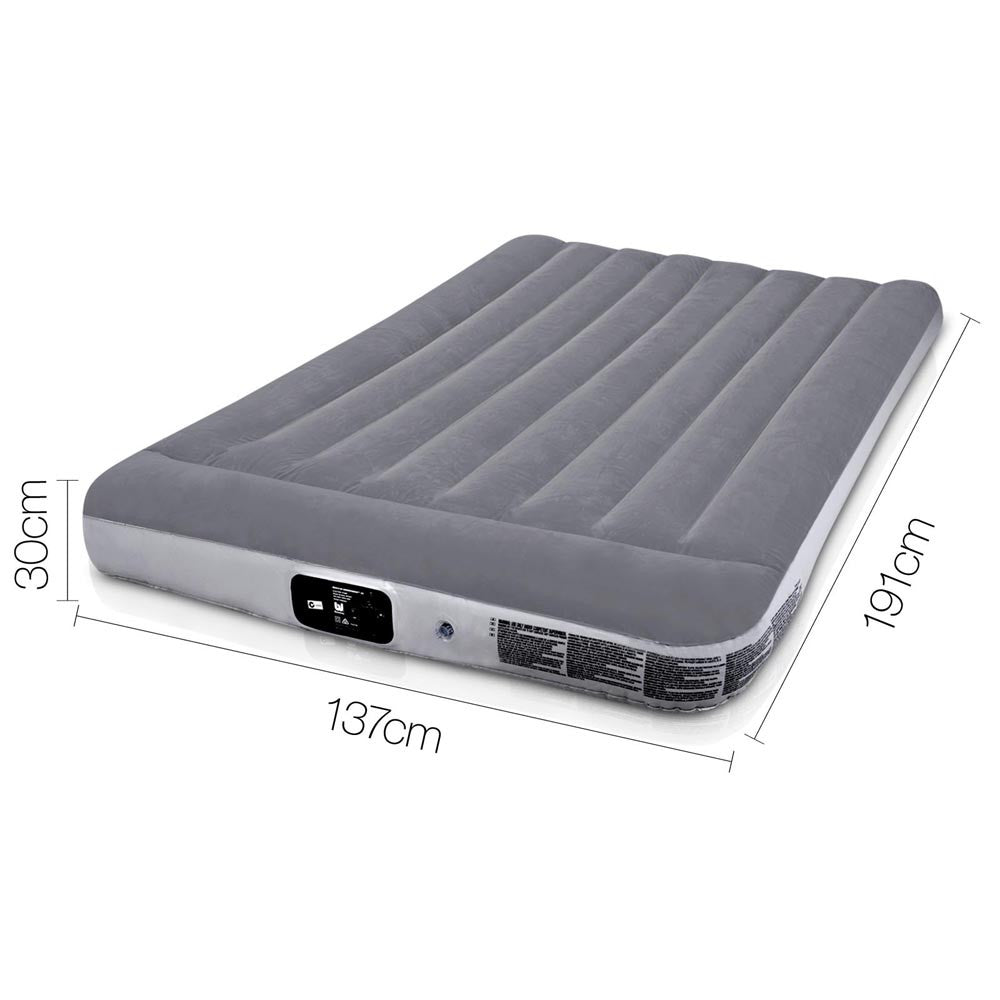 The premium double size airbed is perfect for camping trips and when extra sleeping space is needed for guests. Featuring a comfortable flocked sleeping surface, the airbed provides a smooth and comfy sleep each and every night. Combined with a study I-beam construction and built-in pillow, this premium air bed has been designed for both comfort and functionality. It inflates in just 140 seconds! So you will have an instant bed ready to go whenever the situation calls for a spare mattress. Equipped with a repair patch, the inflatable bed is excellent for indoor and outdoor use! Portable, easy to store and effortless to set up, this convenient air mattress provides you with the perfect balance of comfort, practicality and affordability.