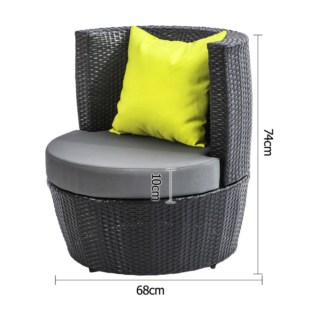 Time to give your backyard a complete make-over with our stylish yet affordable outdoor furniture set! It is made of a heavy duty aluminium frame and UV resistant PE wicker, and together with amazing designs, you won't be disappointed with the quality. The set comes with a tempered glass round table styled with an elegant vase, along with seat cushions padded in high density foam that has weatherproof, UV resistant and tear proof covers. It is designed to be stackable, which makes it easier to store them away carefully with the water proof cover provided. This patio set also comes with two lime colour cushions that will catch your guest's eyes!